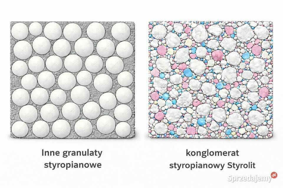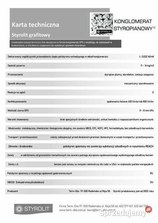 Styrolit to produkowany od 2002 roku materiał do bezspoinowych dociepleń w budownictwie, pierwszy płynny styropian. Regranulat w formie aktywowanego konglomeratu, do ociepleń zasypowych i utwardzania w zakresie 0.2 - 1.8 MPa jako ocieplenie podłóg, stropów i dachów płaskich. Mechaniczna aktywacja pozwala na spajanie dodatkiem cementu w ilości 100 do 150 kg na jeden metr sześcienny. Aktywacja umożliwia stosowanie wyłącznie cementu bez szkodliwych i wywołujących alergie dodatków chemicznych czy toksycznych barwników obecnych w systemach konkurencyjnych. Zapewniamy sprzedaż, transport oraz wsparcie techniczno-projektowe. Oferta zawiera opakowanie o objętości 800 litrów. Dostępne są opakowania od 50 do 800 litrów. Styrolit jest materiałem przeznaczonym do zastosowań w budownictwie, może zawierać drobiny innych materiałów termoizolacyjnych, drobiny piasku, drobiny węglika krzemu z wykorzystaniem którego Styrolit jest aktywowany do skutecznego spajania np. cementem.Term-Eko