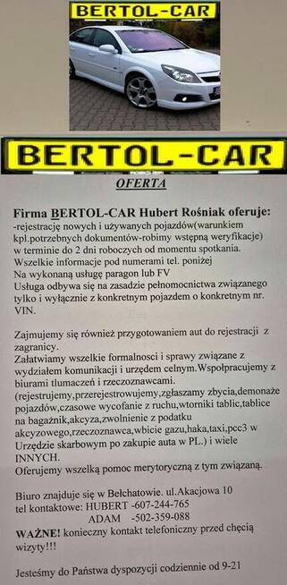 Firma BERTOL-CAR Hubert Rośniak https://www.facebook.com/bertolcar/ oferuje: -rejestrację nowych i używanych ...